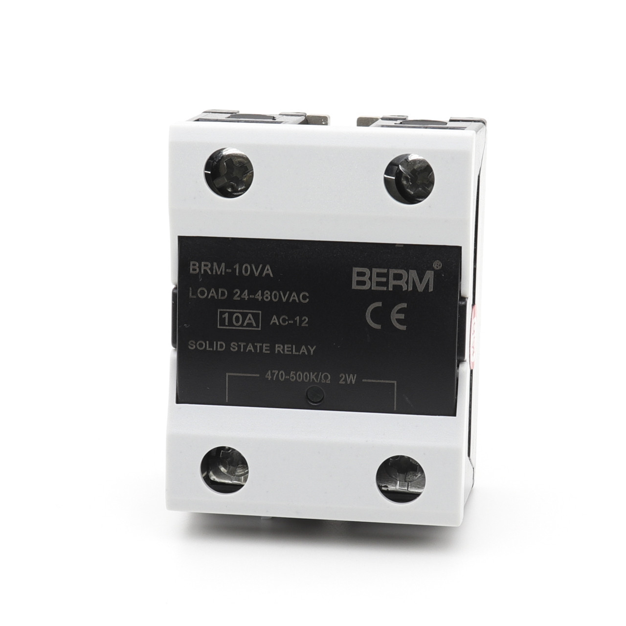Твердотільне реле BERM SSR-10 VA з регулюванням вихідної напруги потенціометром - це сучасне напівпровідниковий пристрій, який призначений для безконтактної комутації силових ланцюгів виконавчих механізмів, переважно нагрівальних елементів (ТЕН), освітлювальних приладів і малопотужних електродвигунів, і інших пристроїв з робочою напругою до 380 В змінного струму і можуть управлятися змінний резистором 250 кОм / 110 В, 500 кОм / 220 В, 1 МОм / 380 В. Реле не призначене для комутації індуктивного навантаження.